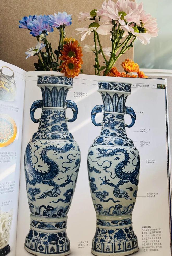 这对花瓶也叫青花云龙象耳瓶,是元代瓷器。当时,中国与中东地区之间的贸易往来十分频繁。这对花瓶是一个名叫张文进的人进献给一座庙宇的。青花瓷一直流行到明清时期。